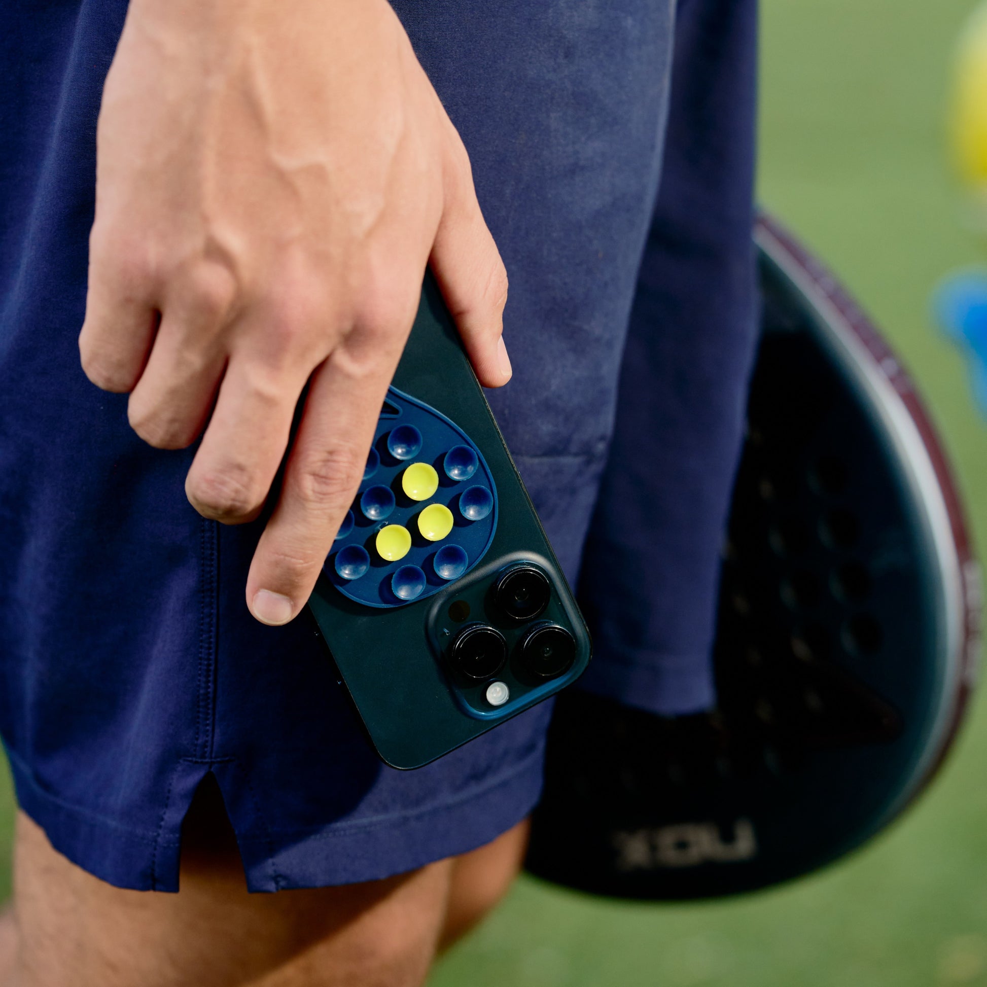 PadelBuddy is a phone mounting accessory designed to help players record their padel matches hands-free. It attaches to the back of your phone or phone case and uses multiple suction cups to securely stick to smooth surfaces such as glass walls on padel courts.