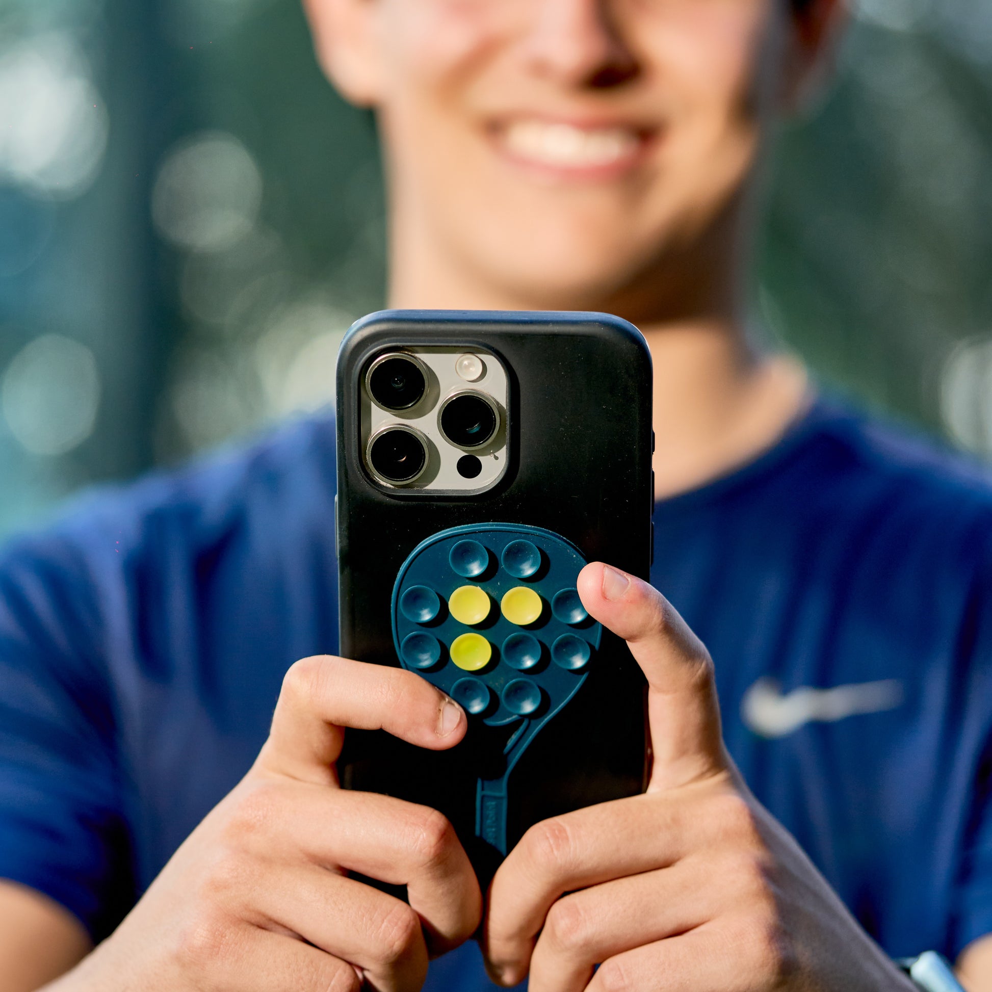 Stick PadelBuddy to the back of your phone or phone case.